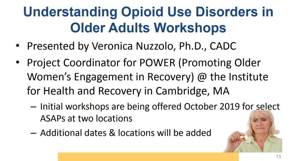 Dr. Veronica Nuzzolo presents Promoting Older Women’s Engagement in Recovery (POWER). Hosted by the Massachusetts Executive Office of Elder Affairs, at TRI-Valley, Dudley, MA, December 11, 2019